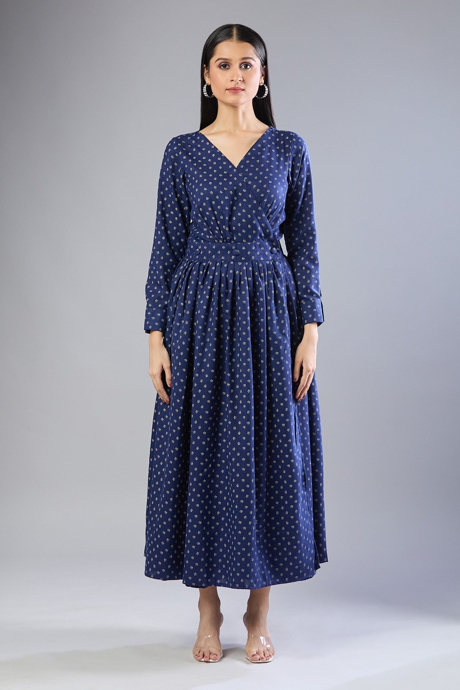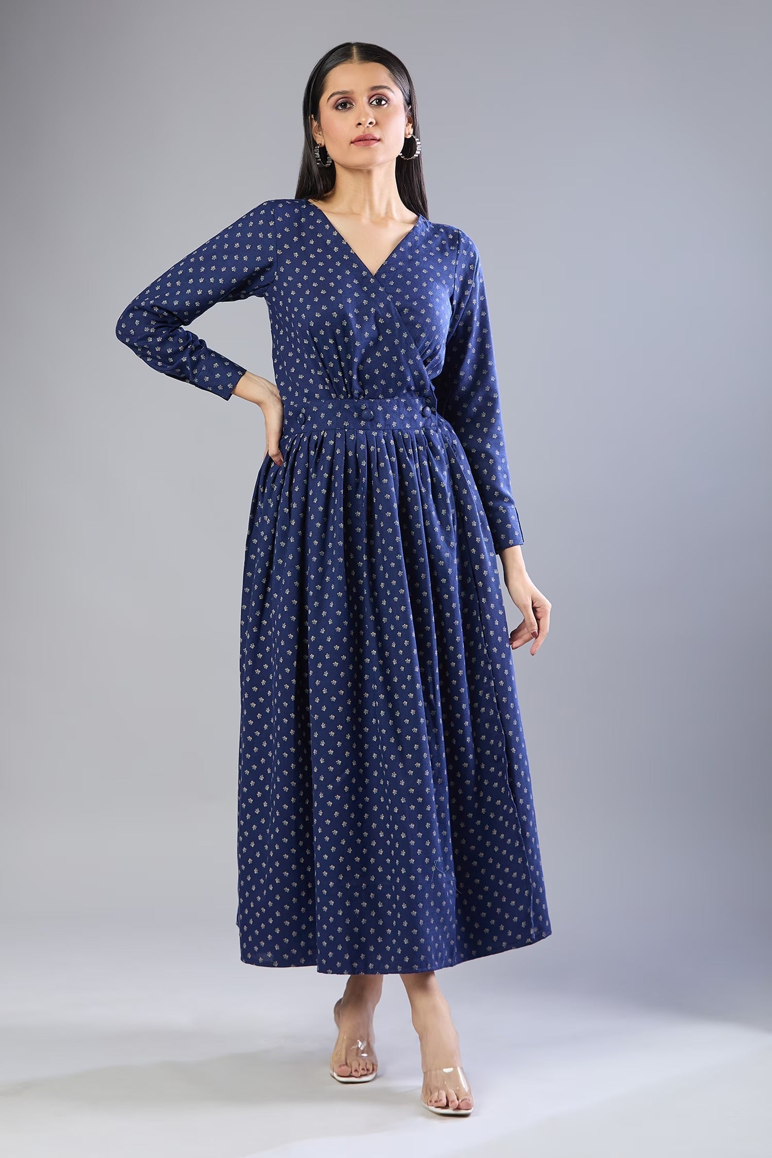 • Noteworthy Feature: Machine-made butti work throughout the dress, V-neckline enhances the silhouette, Gathered waist design for a flattering fit