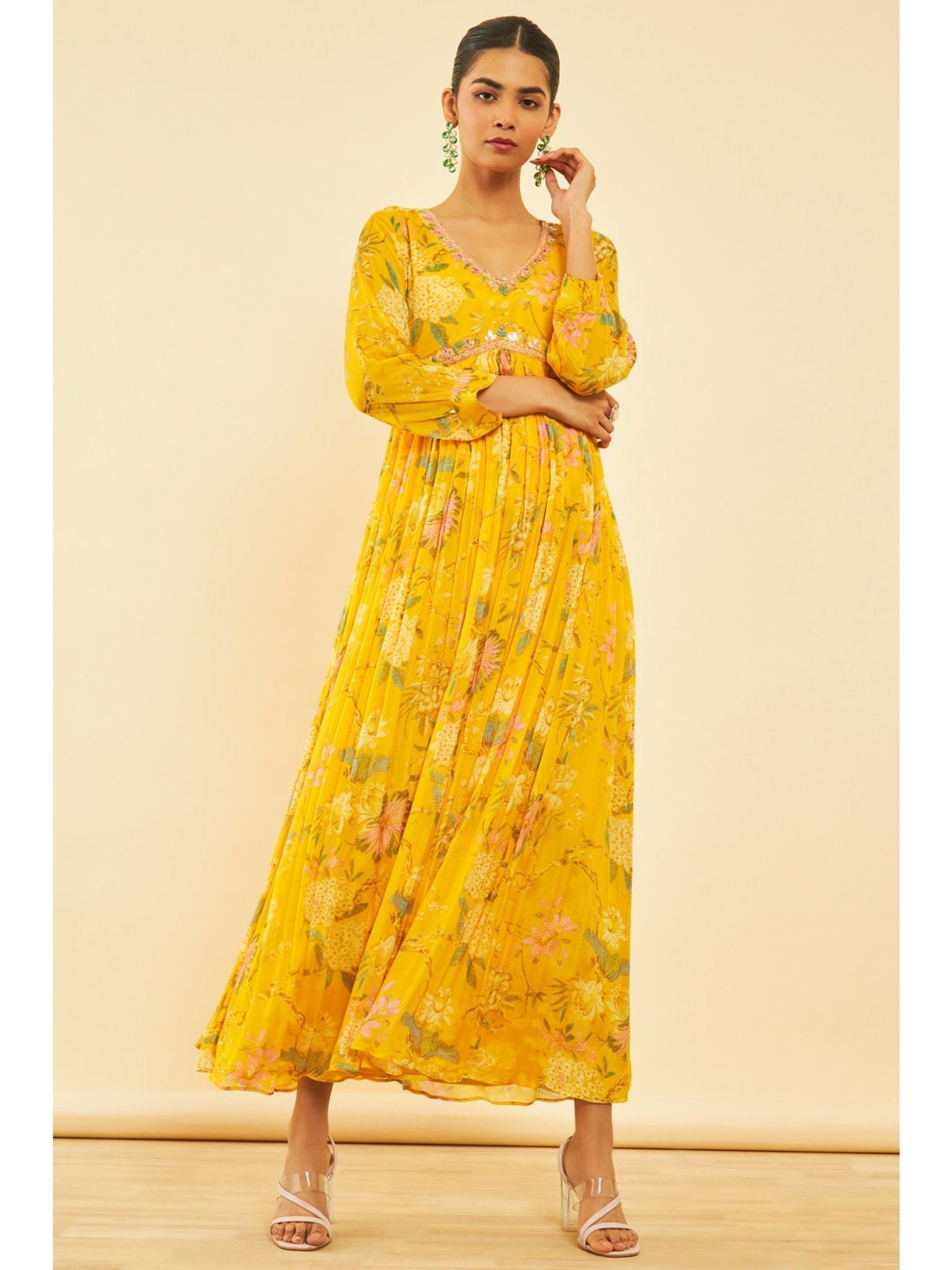 Womens Yellow Viscose Floral Print Alia Cut Dress with Cutdana